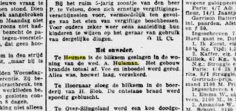 Hier boven het artikel uit de Telegraaf van 19 mei 1911 over de brand van het woonhuis van de weduwe van Albertus Hulsman